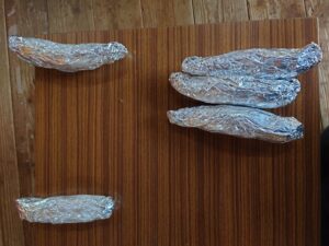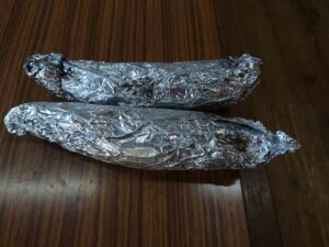 さつまいもを洗って、濡れた新聞紙で包みアルミホイルを被せます。